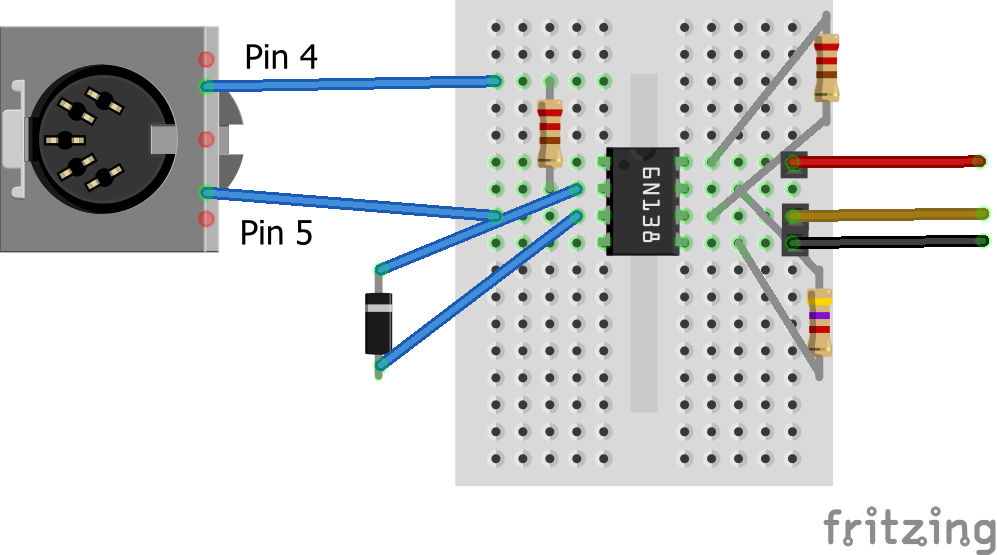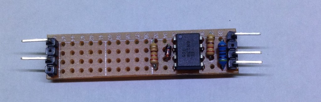 Some versions of this circuit use a 6N139 optoisolator and a 1N1418 diode, and I’ve seen a variety of resistor values too. I went with the notesandvolts circuit, which I’ve used before.