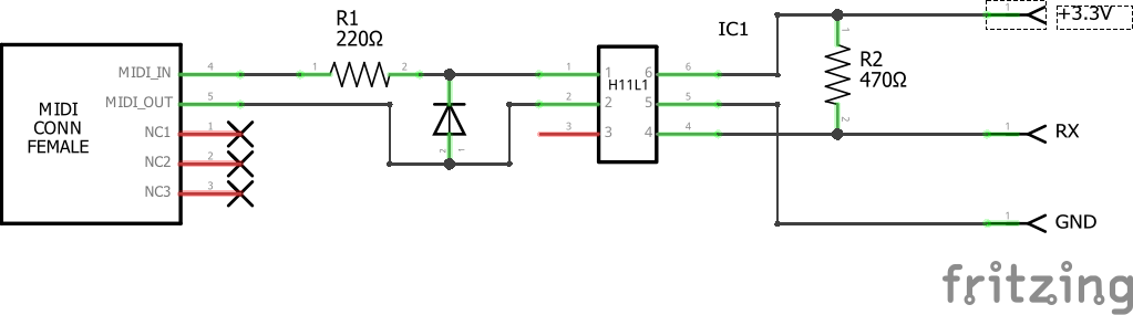• My own 6N138 does indeed seem to work fine powered from a 3.3V supply – i.e. both the orange and red in the first circuit connected to 3.3V – which means I only need one power link to the MIDI board.