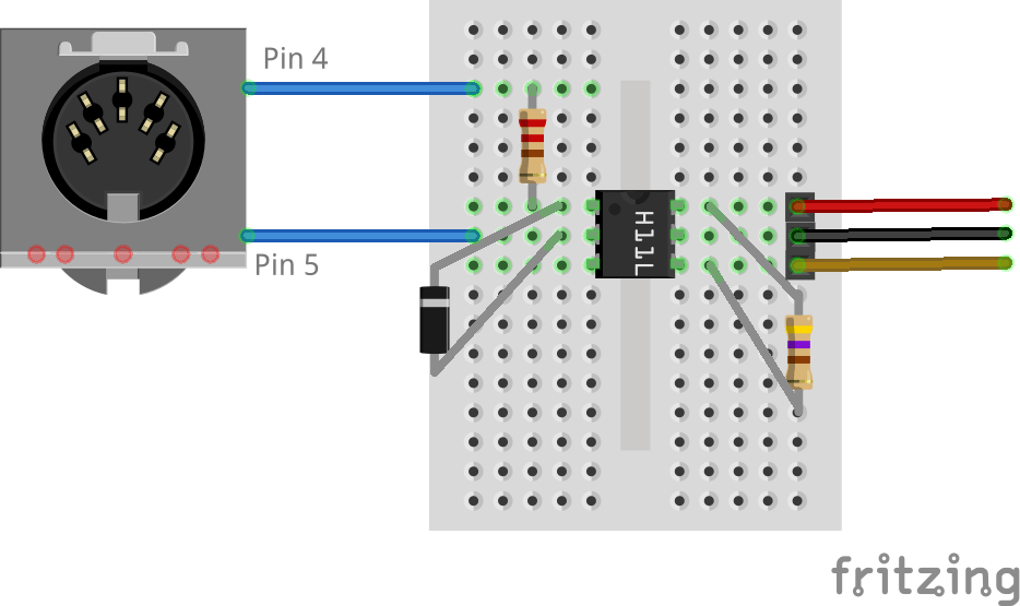 2. I can verify that the H11L1 works as shown in your diagram. However, the drawing of your MIDI jack (DIN) comes out as rather ambiguous so I wasted some time with it with the 2 pins swapped. After fixing that I saw the midi input working. Yay! If there is anything you could do to make it more clear that would help others using this as a starting point. Thanks