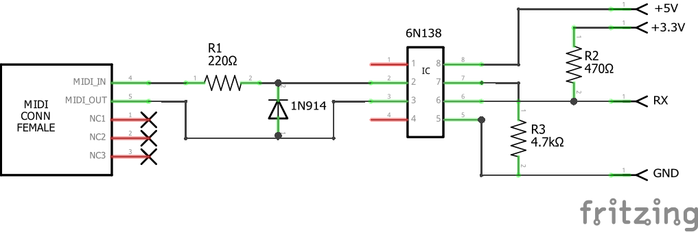 • The 6N138 isn’t really specified for 3.3V operation, even though a lot of circuits on the Internet seem to still suggest it can be used.  It certainly seems best when still powered with 5V.  The recommendation is to use the H11L1 (or H11L2) instead.  Using these parts will also save a resistor!