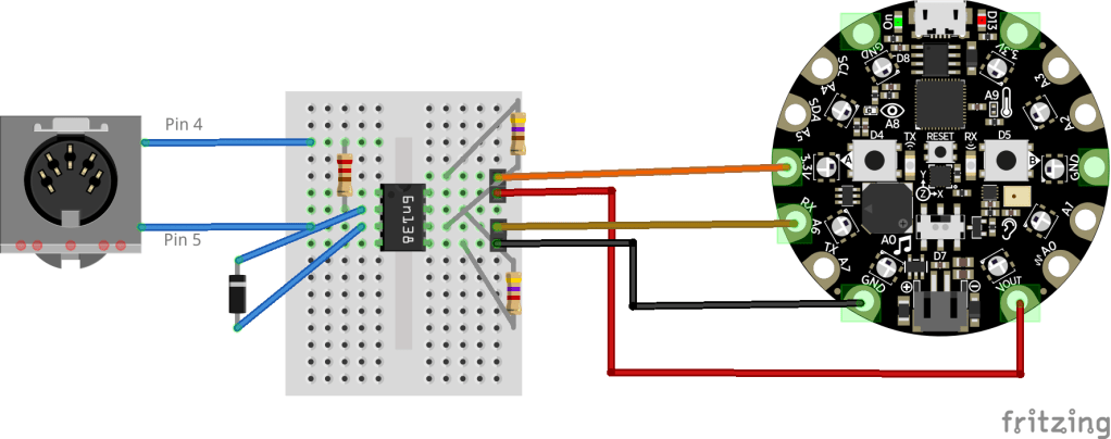 At least in hardware terms, I now have a MIDI IN and MIDI OUT for my Pico and CPX.  The next stage in the hardware development will be to create some kind of plug-in-able “shield” type board for MIDI support.