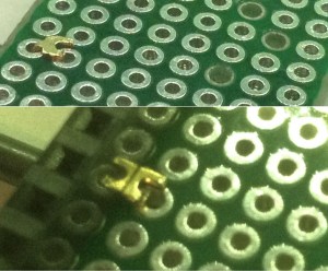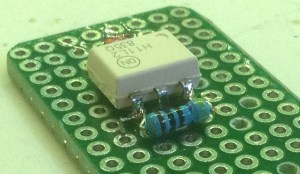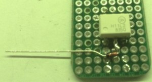 One of the consequences of doing things this way is that I don’t want to the legs of the optoisolator to poke through the board, so the first thing to do was to trim them down as follows.