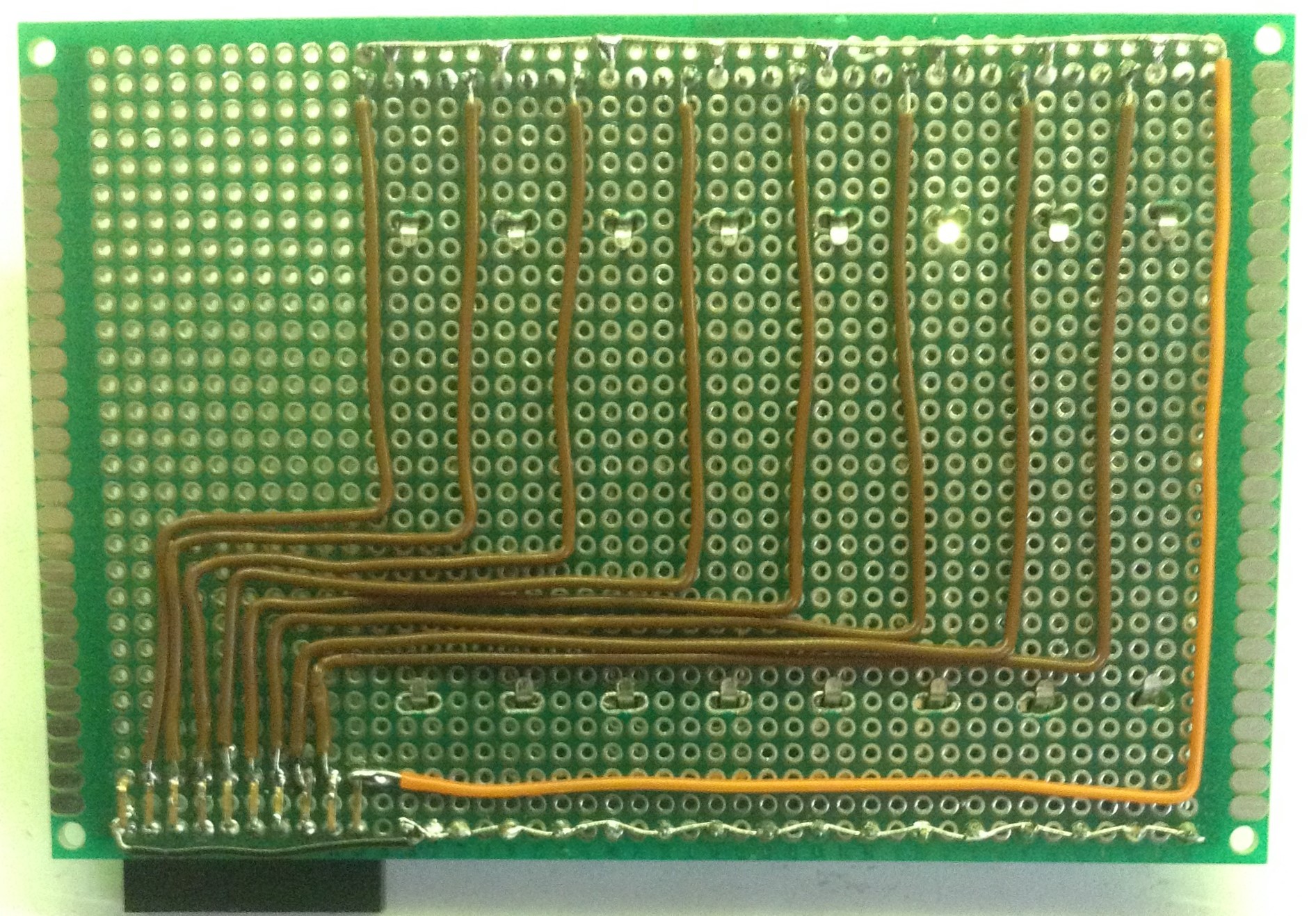 The bottom half is the circuit as before, but I’ve re-routed the power line from the mux to the pots and then added a 10-way header to link to the second board.