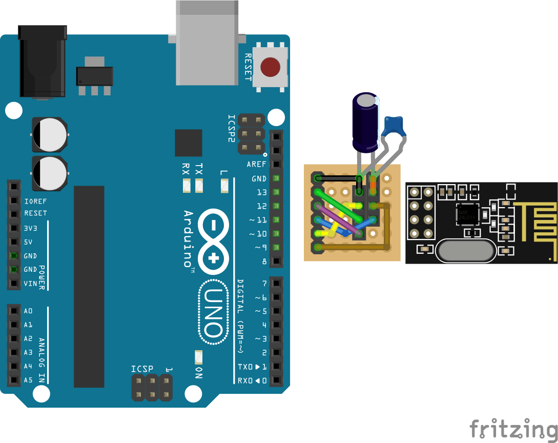 I’ve also allowed for the possibility of adding some capacitors across the power lines for the radio modules. General wisdom on the Internet seems to be that when using these modules from an Uno’s 3V3 supply directly it is well worth adding a 10uF capacitor to help stabilise the power supply. This turned out to be pretty critical for me later on!