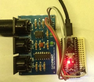One thing I thought was a useful addition was an LED. I can’t use the built-in LEDs on the Arduinos for indicators of MIDI activity as for ATmega328 based boards like the Uno and Nano they are connected to D13 which is now being used for the SPI interface to the radio. Instead I used an external LED and resistor connected to D4 and GND. Actually, I cheated slightly and set up D5 as an OUTPUT pin set to LOW to act as the ground connection for the LED so I could plug it into two adjacent pins. If you want to do that too you’ll need to add the code to drive D5 LOW too.