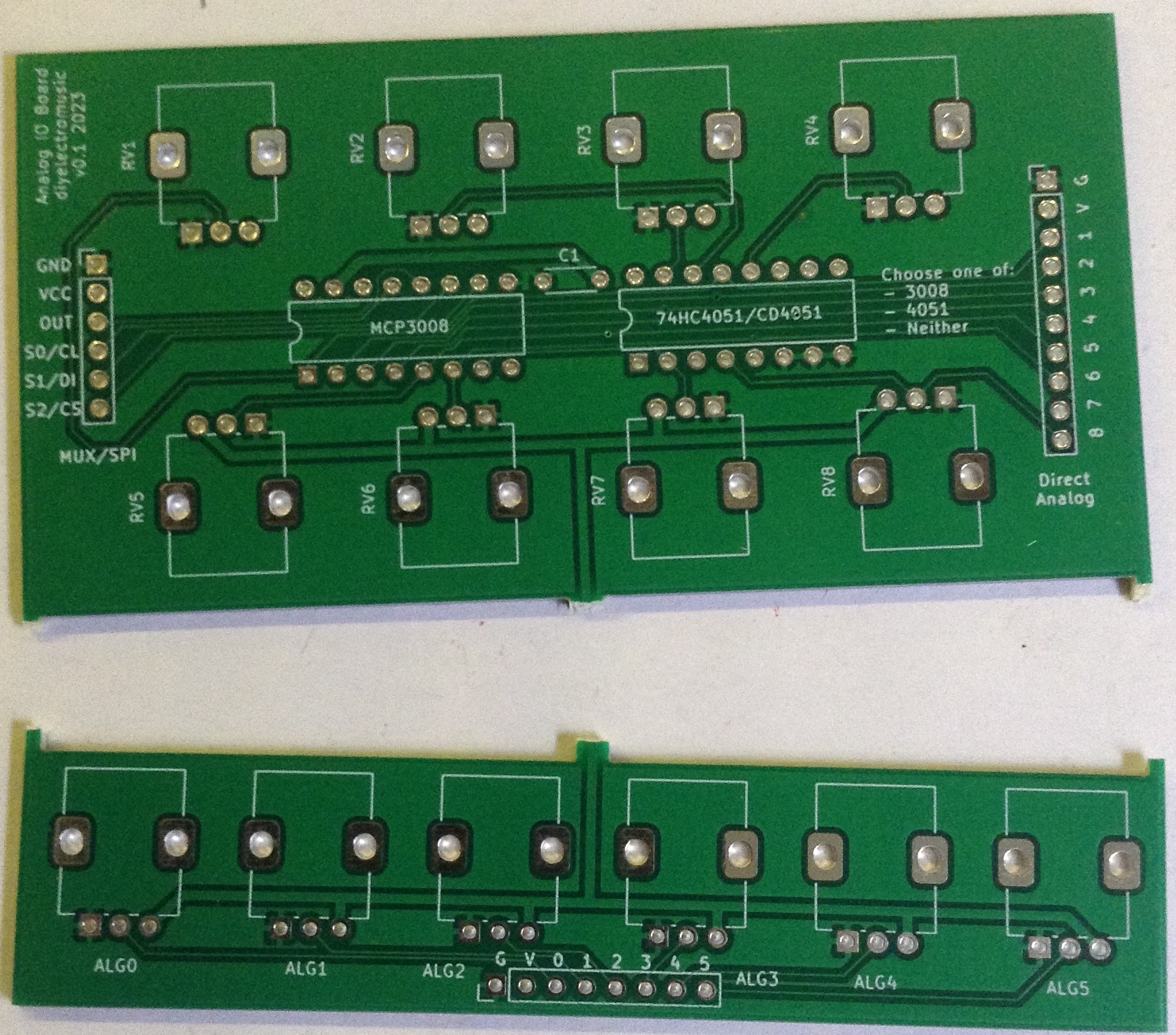 Here are some build photos. Note that this shows both DIP sockets populated, but in practice only one or neither may be used. It also shows all pin headers populated and again for the 8-way board it is more likely that only one of the left (if used with the MCP3008 or 4051) or the right (if used directly) is used.