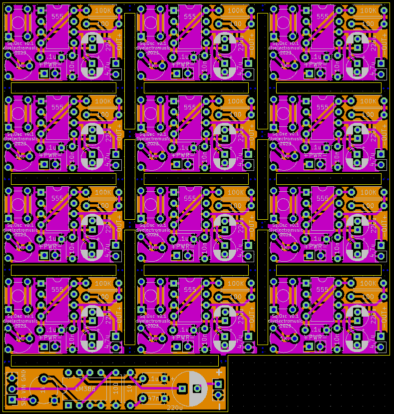 This PCB is essentially the oscillator part of the Poly 555 in an independent unit. I wanted several “single button” oscillators that I could do something different with at some point, but as they turned out so small, I paneled them up and this was the result.
