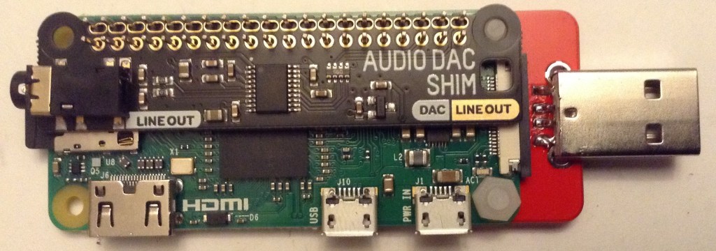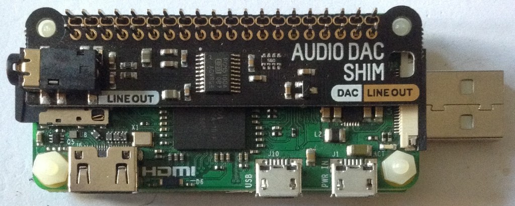 A really good, low-profile one ideal for use as a dongle is the Pimoroni Audio SHIM, which can be found here. It doesn’t even need soldering, it can push-fit over the Pi’s GPIO headers, but any I2S audio interface for the Pi can be used as long it doesn’t interfere with the USB plug for the “dongle”.
