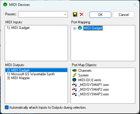 When plugged into a PC it will come up as “MIDI Gadget” as a USB MIDI compatible device. Here it can be seen in MidiOx, being selected as the MIDI output.