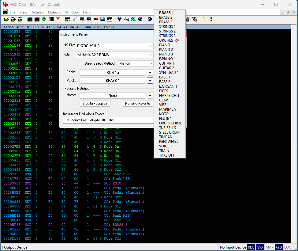 In MidiOx, View -> Instrument Panel, select “INS File: DX7ROMS.INS” and then choose one of the following for “instr”:
