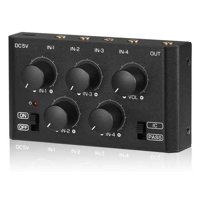 I have a couple of cheap mixers from an overseas marketplace branded DOUK “Little Bear Audio”. I’ve model “MX5” and “MC5-BX”. These are small, USB-C powered, four-way mixers. The MX5 has either STD or 3.5mm stereo inputs and either STD or 3.5mm stereo out; the MC5-BX has 3.5mm stereo inputs/output only. These seem to be available for around £30-£40 depending on where you look.