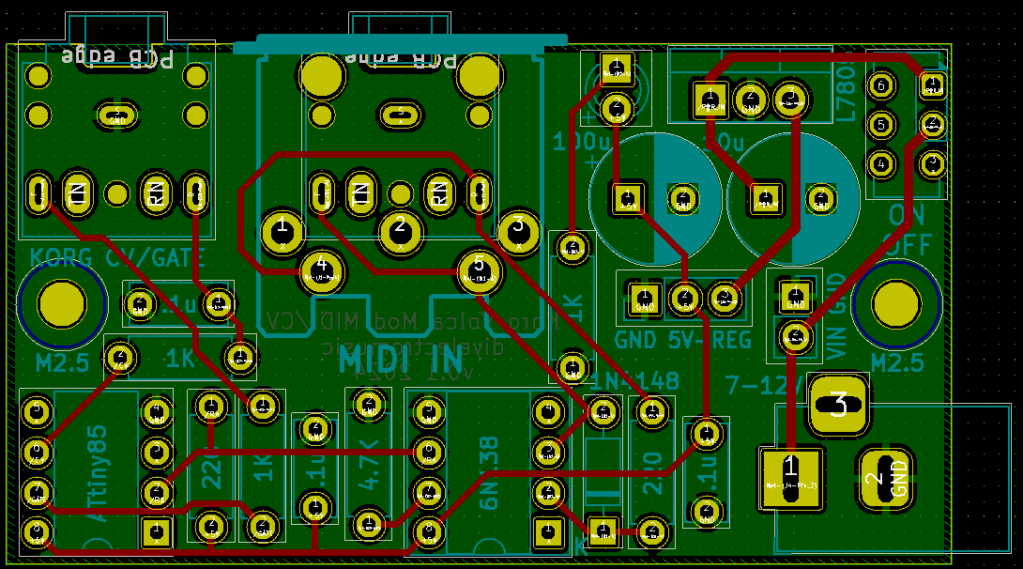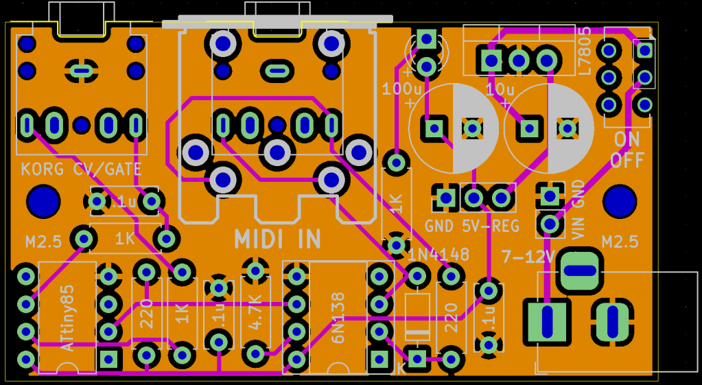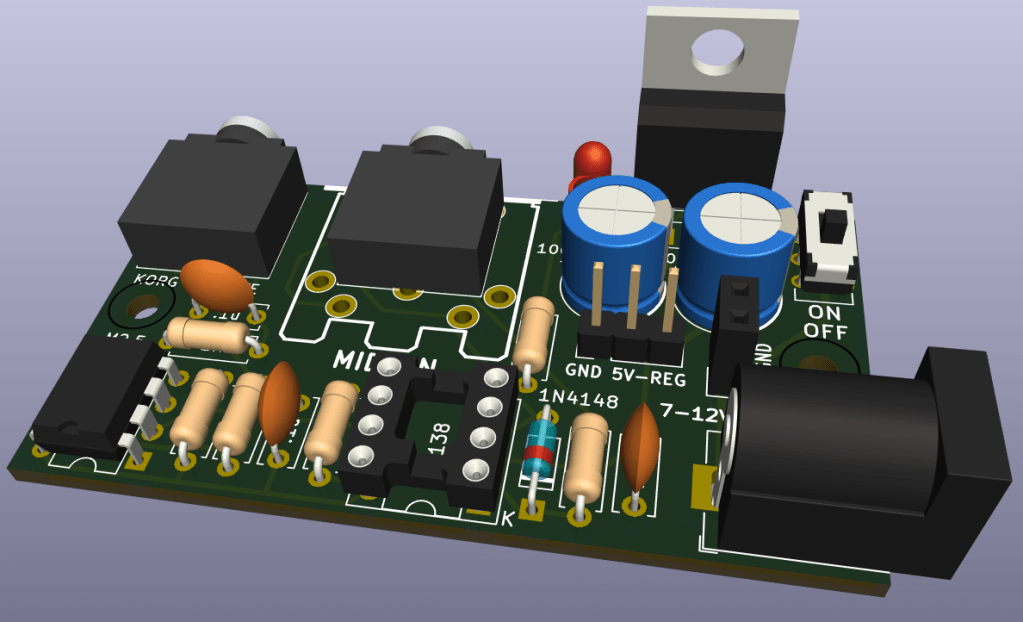 There are some conversion kits available (apparently MIDI is broken out on the PCB inside – more here), but it also has a well-specified CV/Gate interface, so this is a design for a MIDI to CV converter with a Korg Volca Modular compatible CV/Gate interface out via a 3.5mm TRS socket.