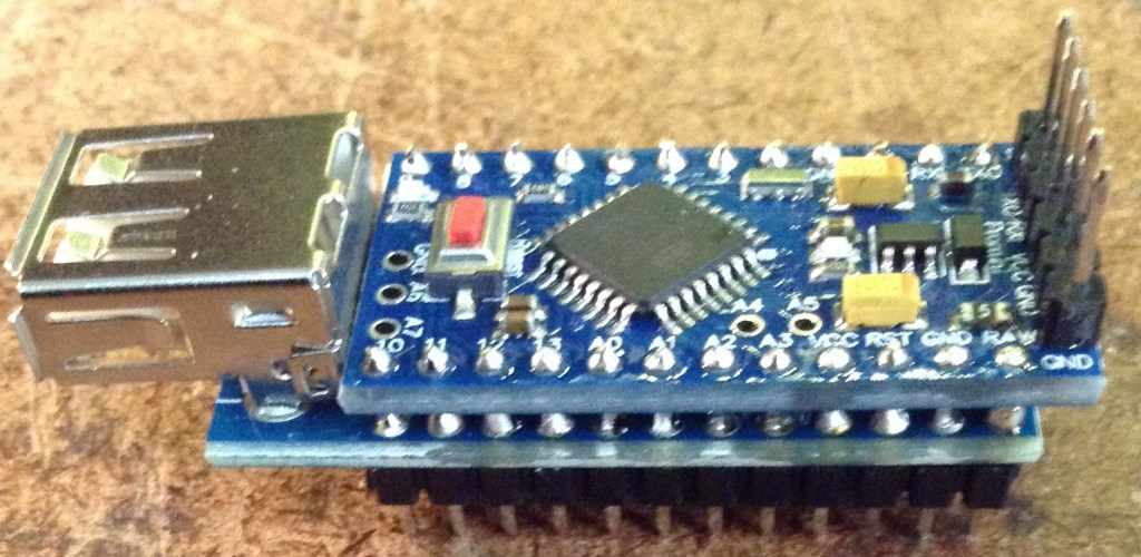 - EITHER: Arduino Pro Mini 3V3/8MHz version plus mini USB Host shield (see photo).