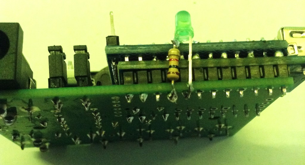 I’ve mounted the Arduino on top of the shield. If the Arduino hasn’t been programmed, then programming header pins will also be required.