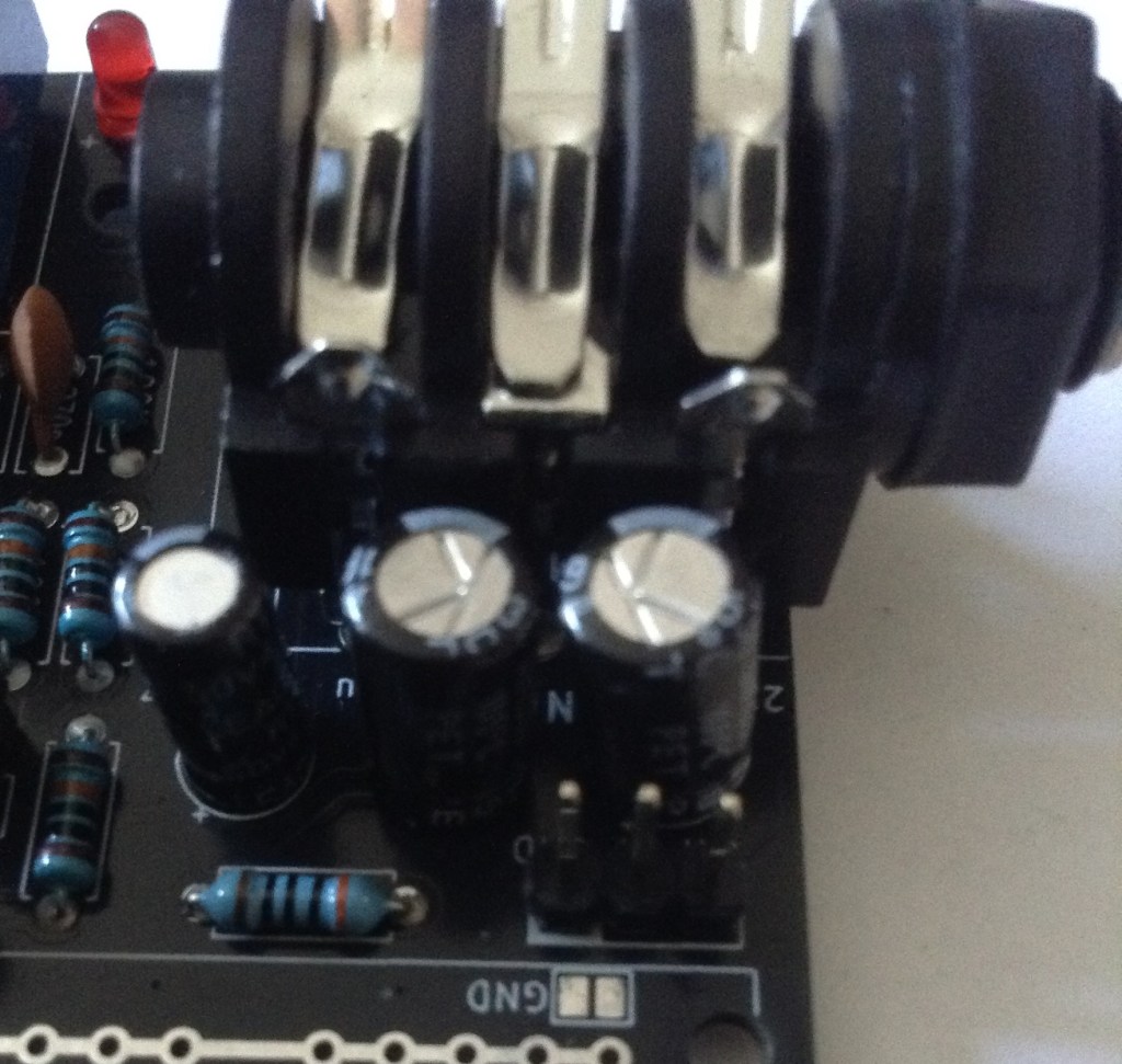 Note in my first build I soldered on the electrolytic capacitors before the headers. It is actually a lot easier to do this the other way round! I recommend soldering the pin headers first.