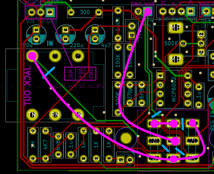 It is annoying that the jack footprint wasn’t obvious which way round it should go, although I can see how the silkscreen does sort of relate to the layout of the socket. What is annoying is that I hadn’t spotted that the signal track was going to (obviously with hindsight) the connector of the socket that makes contact with the shield.