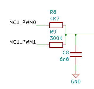 We can see that the ratio of resistors is given by 4,700 / 300,000 which is pretty close to 64. This is 2^6 so it is allowing for a 12-bit audio output resolution with the most significant 6-bits on PWM0 and the least significant 6-bits on PWM1.