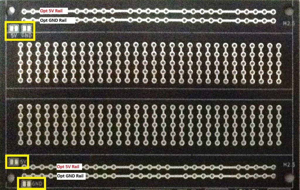 If the prototyping area is being used then there are two solder bridges that can be used to connect one or both positive power rails to 5V and one or both negative rails to GND.
