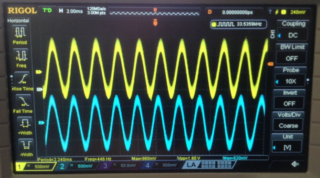 In the following trace the blue trace is the signal at the IN jack and the yellow trace is the signal at the OUT jack. The gain has been adjusted to make them essentially the same amplitude.