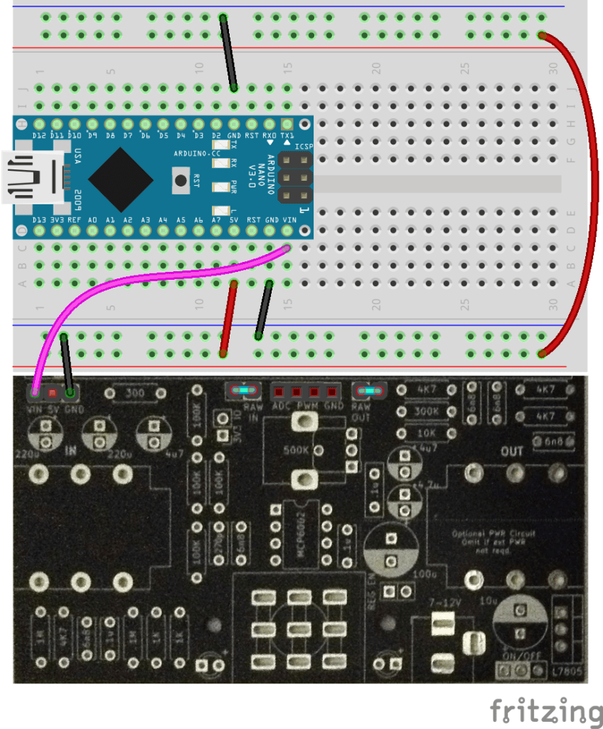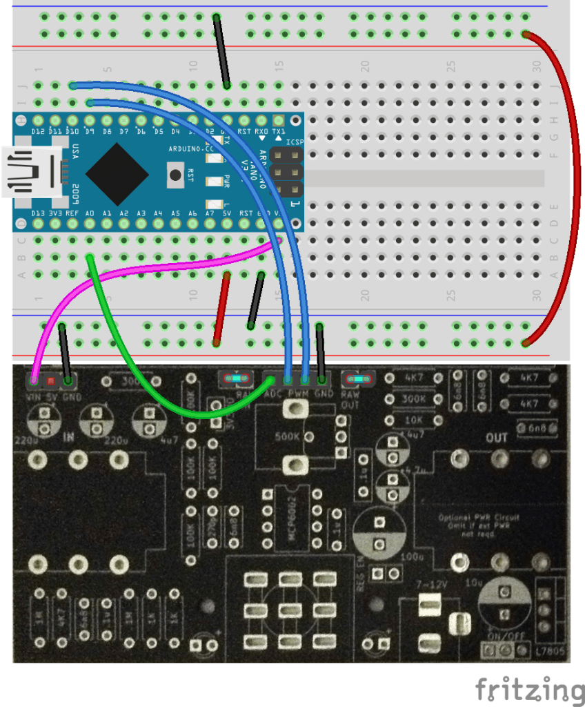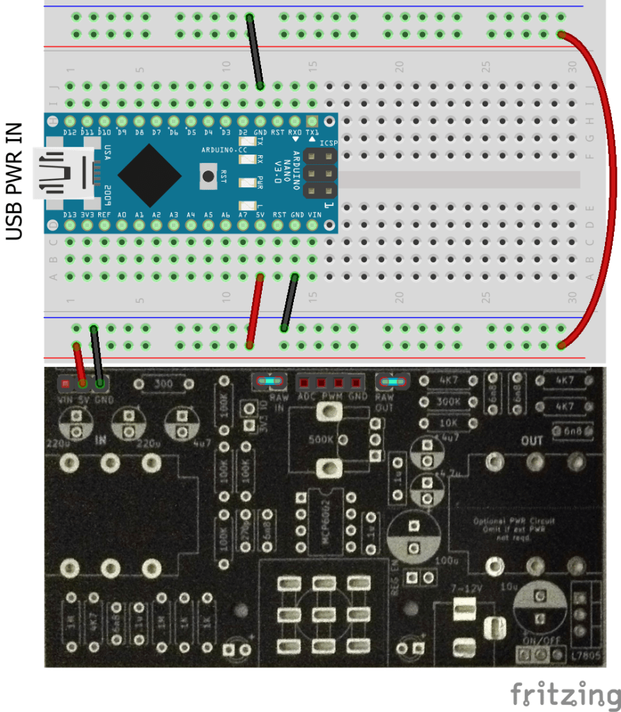 It is possible to power the PCB and breadboard from the microcontroller’s 5V USB connection.