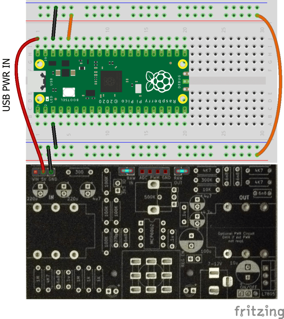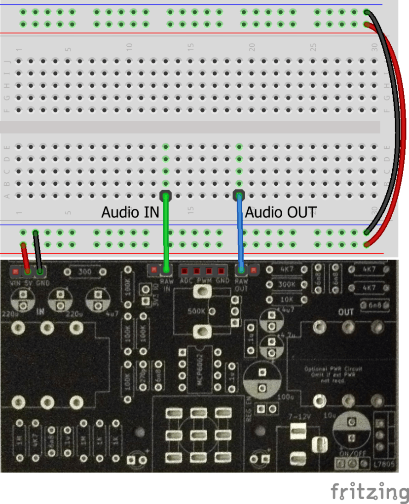 If a microcontroller isn’t being used and access to the RAW guitar signal is required, then it can be obtained by removing the RAW IN jumper and patching a jumper wire to the RAW pin.