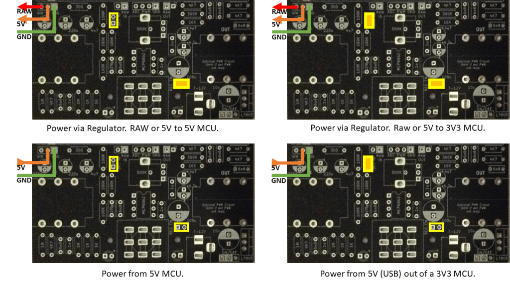Patching into 5V or GND is left as an option to allow for the use of a 5V, 3V3 or no microcontroller as required.
