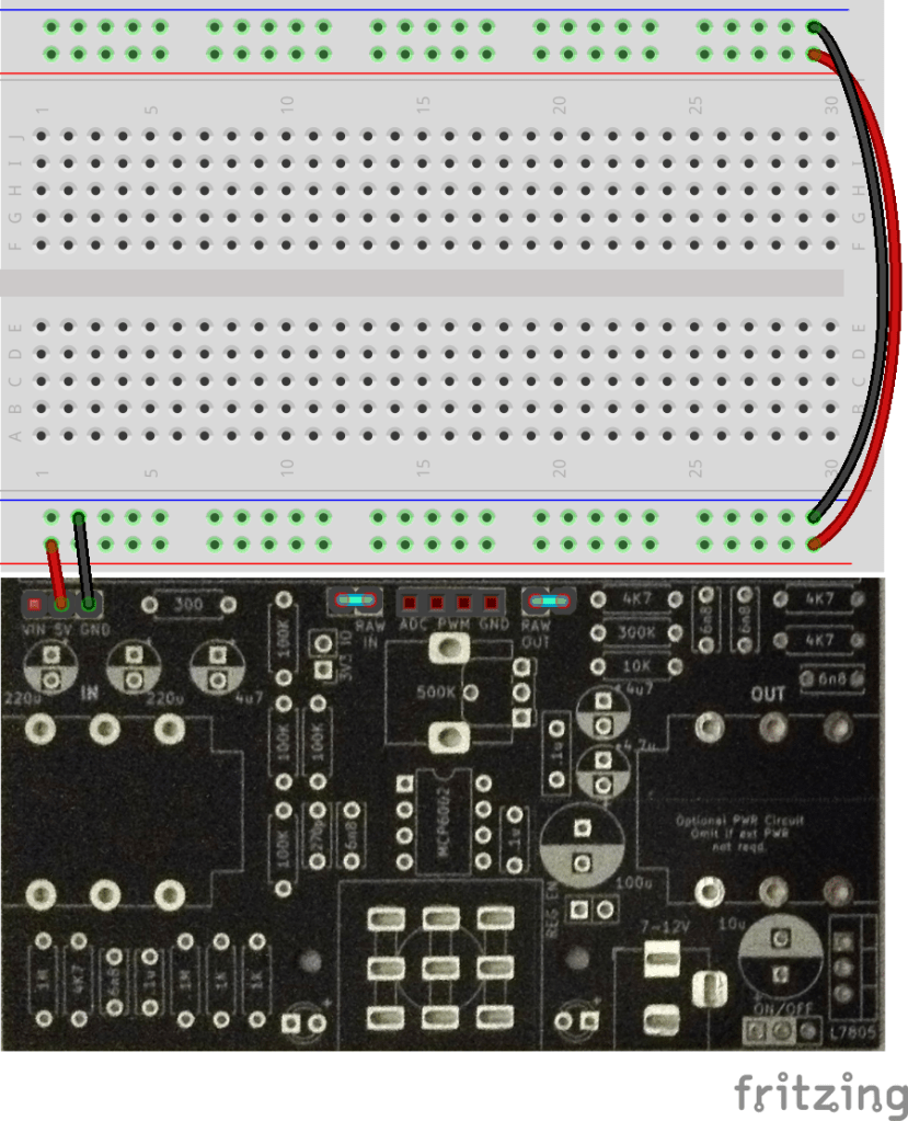 The power rails of the solderless breadboard can be powered from the PCB using the 5V and GND from the PCB-based regulator.