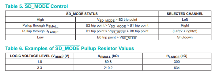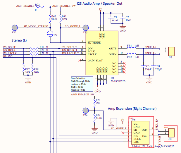 These are standard power and I2S (PCM) audio connections, apart from GPIO16 “Amp Shutdown”. This is connected to “SD_Mode” of the MAX98357A (see above schematic section). The datasheet tells us that driving this LOW will put the amp into shutdown. But it also says it is responsible for selecting the mode of the amplifier, depending on the resistor used to drive SD_Mode HIGH. Example resistor values are provided for 1.8V and 3.3V operation: