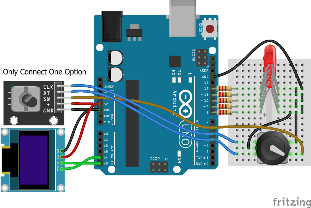 The diagram also shows how to connect a 128×64 I2C OLED display. These are the very common SSD1306 based displays. Note that the pinouts on these can vary with GND/VCC swapped or SCL/SDA swapped, but they must be connected to 5V, GND and A4 (SDA) and A5 (SCL).