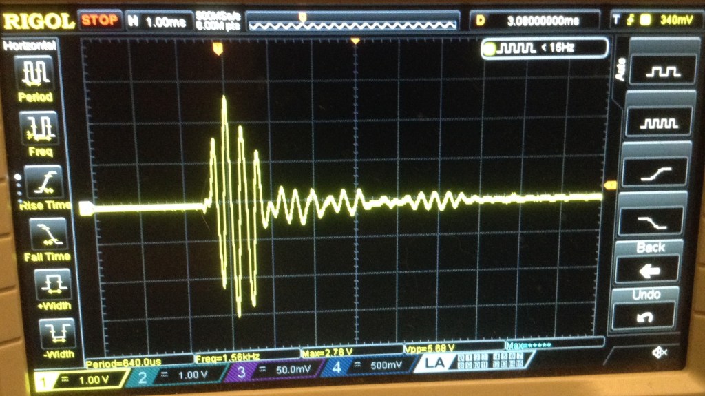Connecting up an oscilloscope to the trigger signals once connected shows me that the Arduino’s 0 to 5V pulse becomes a 0 to ~2.5V to 3V pulse when plugged into the iDM02. But it is still recognised.