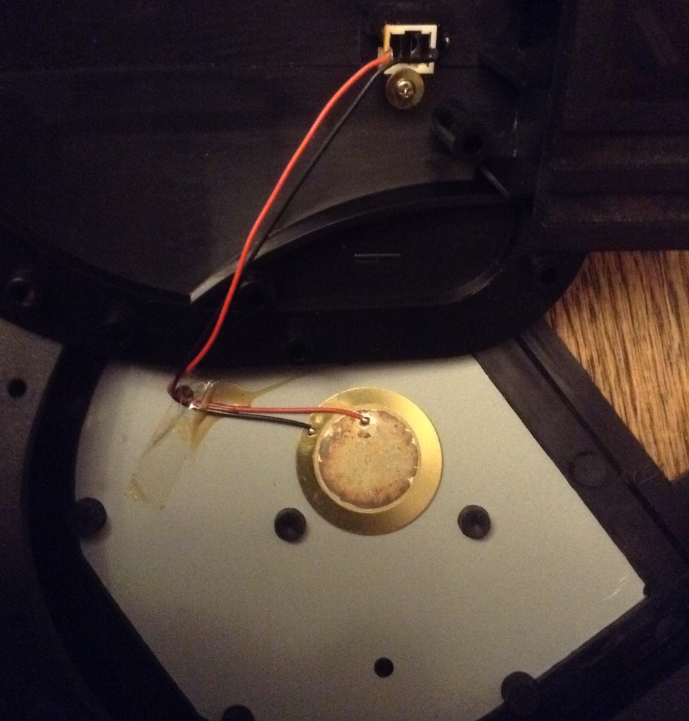The pedal is a simple switch – I’ve verified this with a meter. When pressed, the switch is closed. The pads seem to simply be a piezo sensor wired directly to the TS socket. Here is a pad sensor with the rubber pad removed.