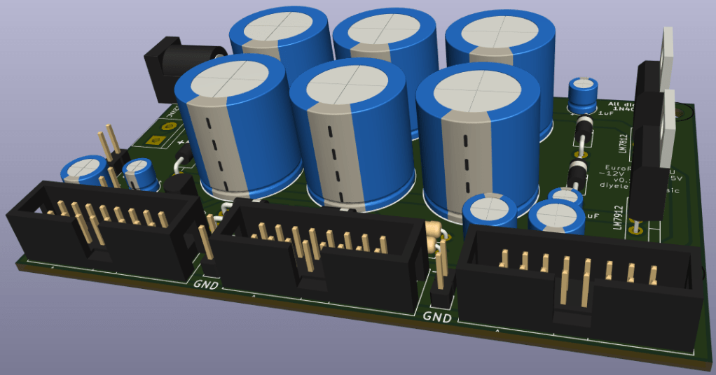 I believe this design should work ok for me, but I don’t have any confidence in my knowledge of what is actually required in a power supply, so I won’t be publishing the files as usual for this one. In particular, I’m not confident in things like how the GND is managed and optimal placing of the capacitors, but I’ll see how things go. I expect this will be fine for my own “Lo-Fi” playing around.