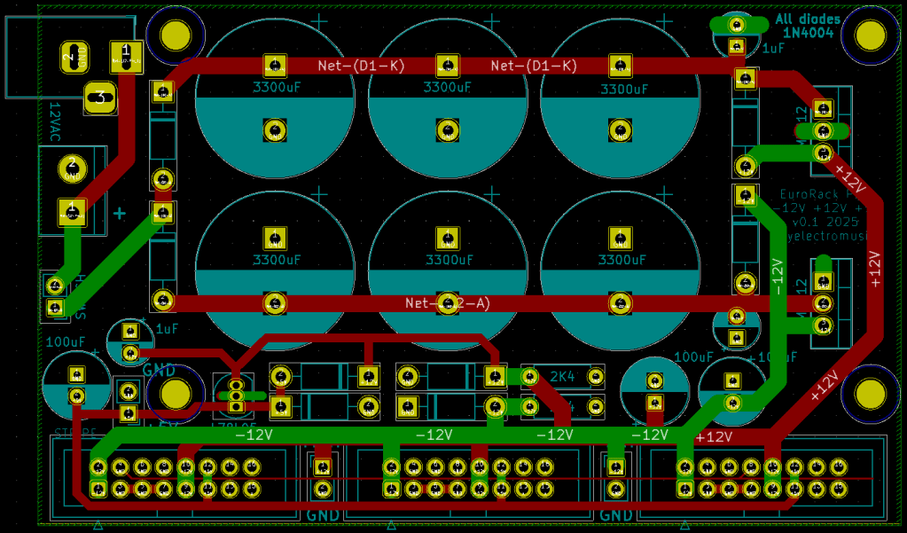 As I say, I’ve left in the footprints for two load resistors (the two 2K4 ones) but as explained in the MFOS write-up these are optional and only required if there are issues starting up. Apparently the regulators need some load to reach a useful output level and if no modules are connected, having load resistors here helps. Without the resistors, with no modules plugged in, it won’t be possible to measure accurate voltage levels at the outputs.