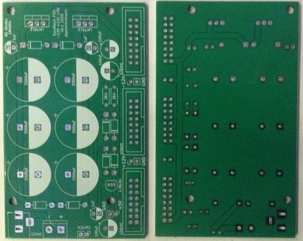 I’ve included four evenly spaced mounting holes and attempted to leave space around the two 12V regulators for a heat sink. With hindsight it would have been more useful to have the holes supporting the three EuroRack connectors a bit more.