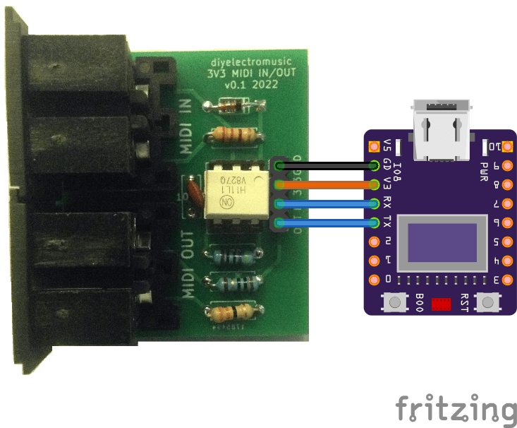 This is using my 3V3 MIDI Module PCB connected as follows: