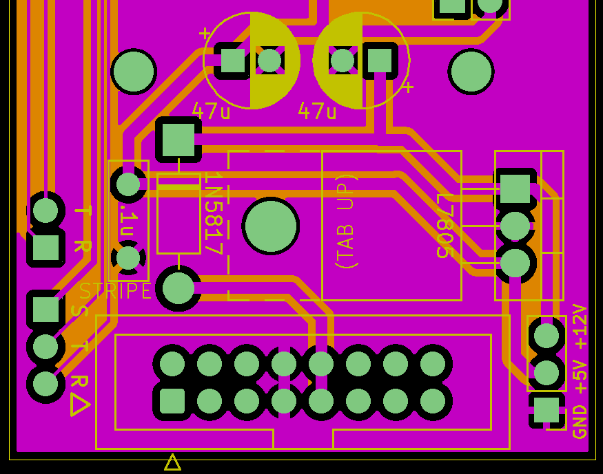 Also, as previously mentioned, I’ve included two footprint options for the L7805 – one vertical and one (tab up) horizontal. The idea is to provide options when it comes to adding a heatsink.