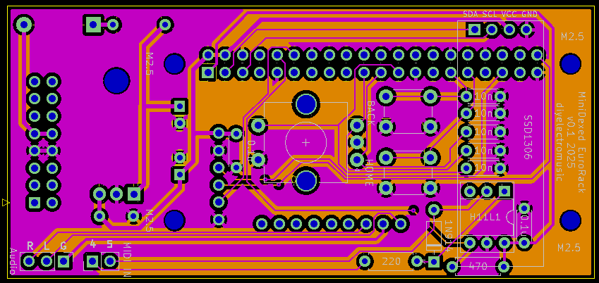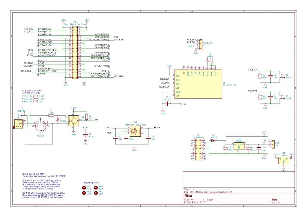 In terms of the circuit, this is essentially my MiniDexed Raspberry Pi IO Board in the SSD1306 format with the EuroRack power supply from my EuroRack 6HP MCU Experimenter Module.