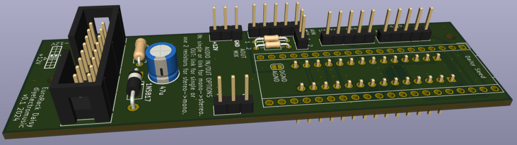 - I’ve included additional header pins to breakout some of the Daisy Seed IO that didn’t make it to the connector: USB, UART1, and SAI2.