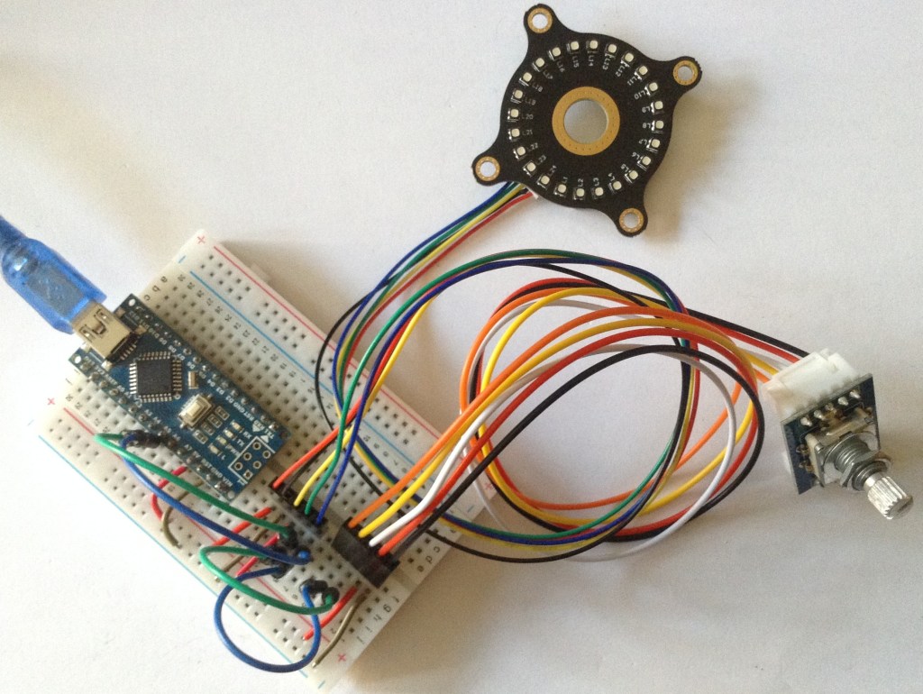 Note that this is powering the LED ring directly from the Nano’s 5V, which itself is powered from the USB socket. Most standard USB sockets would be good for around 500mA I believe, so this should be ok, especially if all LEDs are not on at the same time at full brightness.