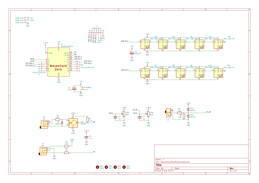 I’ve chosen to include a single 5V power jumper for power in, so will consider any EuroRack style powering options as a separate project.