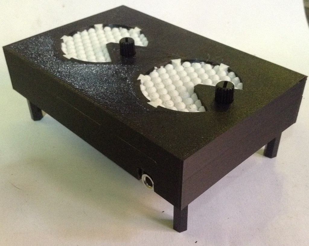 I’ve used four brass 6mm spacers to screw into the mounting holes in the frame. Then the PCB can be inserted, taking care to squeeze in the 3D printed support around the LEDs and pots, and fixed with 20mm spacers which will also act as “legs”.