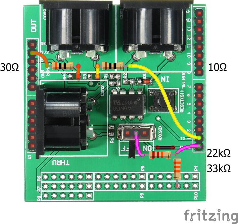 - 1x 10Ω, 1×30Ω resistors for MIDI OUT