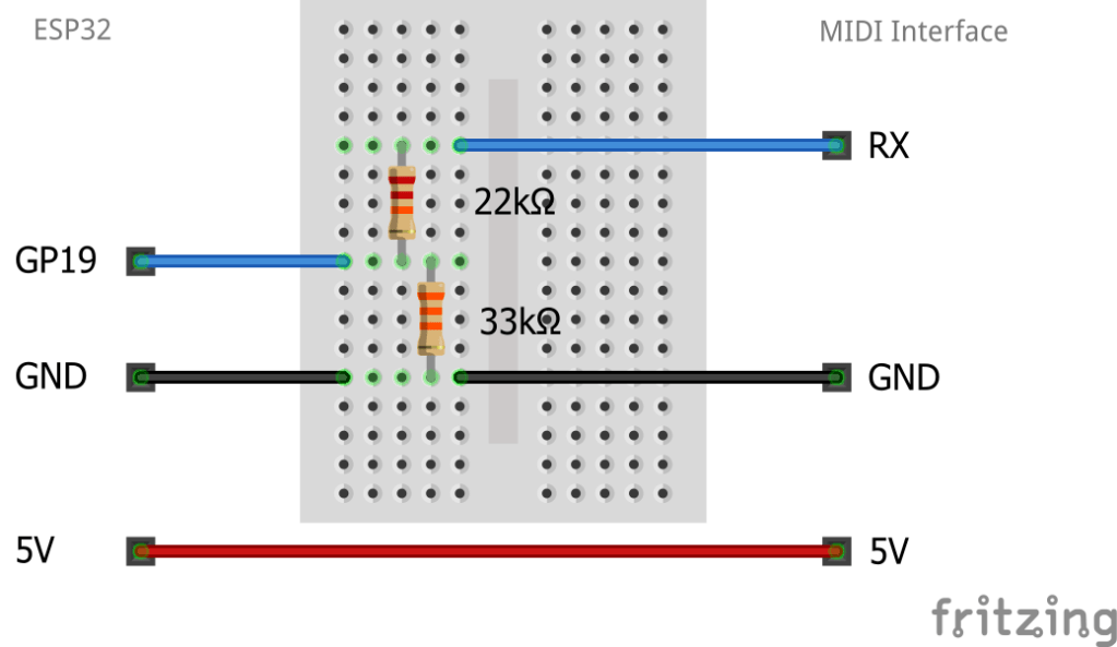 - 1x 22KΩ, 1x 33KΩ resistors for MIDI IN