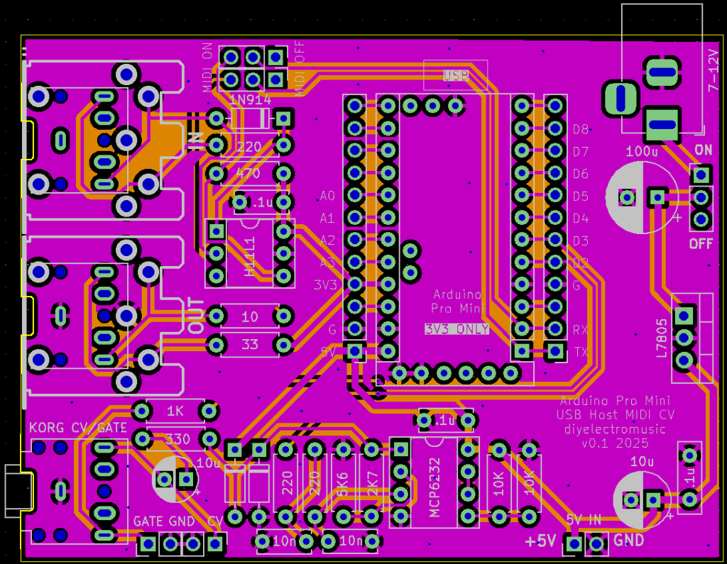 I’ve included a MIDI switch with the footprint of a 2×3 set of 2.54mm headers so that could be jumpers or a switch as required. If the Pro Mini is socketed (which isn’t so easy if a USB Host shield is attached, but would be possible with longer pin headers), then the MIDI switch could be omitted. It is only there to disconnect MIDI from the Pro Mini UART when uploading sketches.