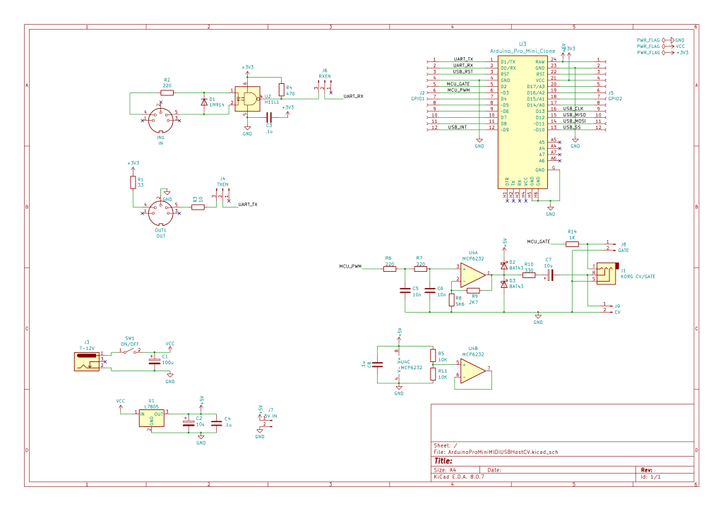 This is essentially a version of my Korg Volca Modular MIDI to CV PCB Design merged with my Arduino Pro Mini MIDI USB HOST PCB Design to give me USB MIDI to serial MIDI and CV.