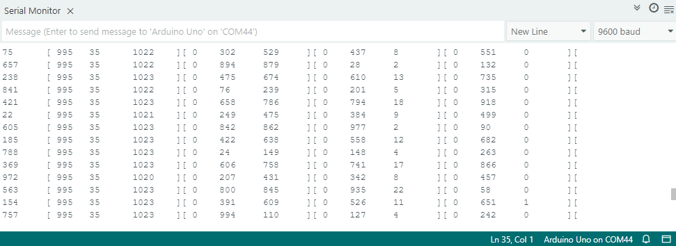 The main Arduino loop simply prints out various values sampled (at “loop speed”) from the processing as it happens.