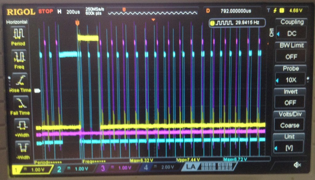 We can clearly see the ADC processing stopping prior to the start (the trigger point and yellow HIGH trace), as well as the timer routine taking a lot longer at this point. Presumably this is running four of the map/constrain operations on the counter readings to turn them into analog readings.