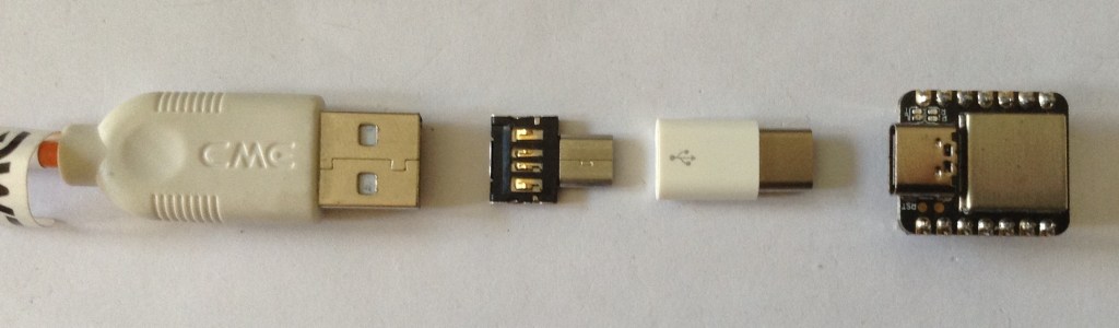 To plug anything in however will require an adaptor or two. This needs to go from an original “USB A” plug to a USB-C socket. For me, this involved using a “USB-C to USB-micro” adaptor and then a “USB OTG adaptor” as shown below.