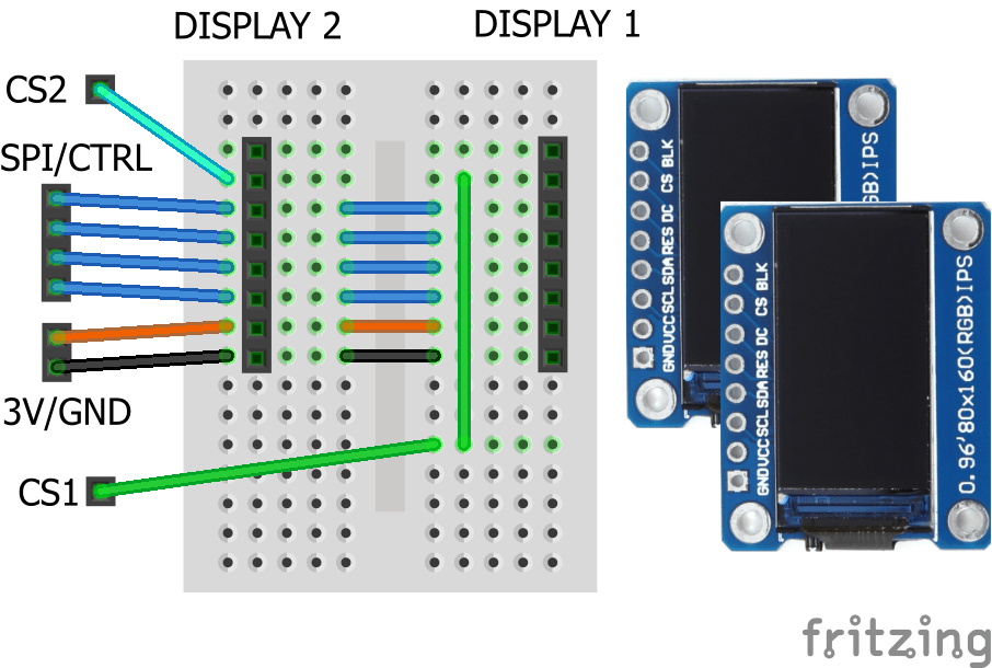 - 2x 0.96″ ST7735 60×180 SPI TFT displays.