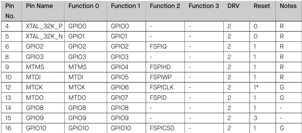 From the Technical Reference manual, we can see that the default Arduino definitions above, do not support the non-routed, direct-to-IO MUX pin mappings, which from the table below do indeed map onto GPIO 2, 6, 7, 10.
